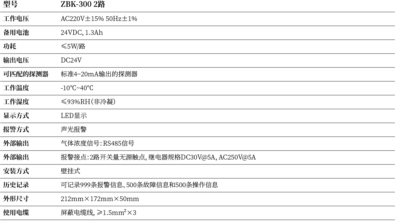 ZBK-300气体报警控制器与PLC、PC等及我公司4~20mA电流输出的气体探测器组成工业用气体报警控制系统。气体报警控制器通过RS485接口与PLC或PC通讯。